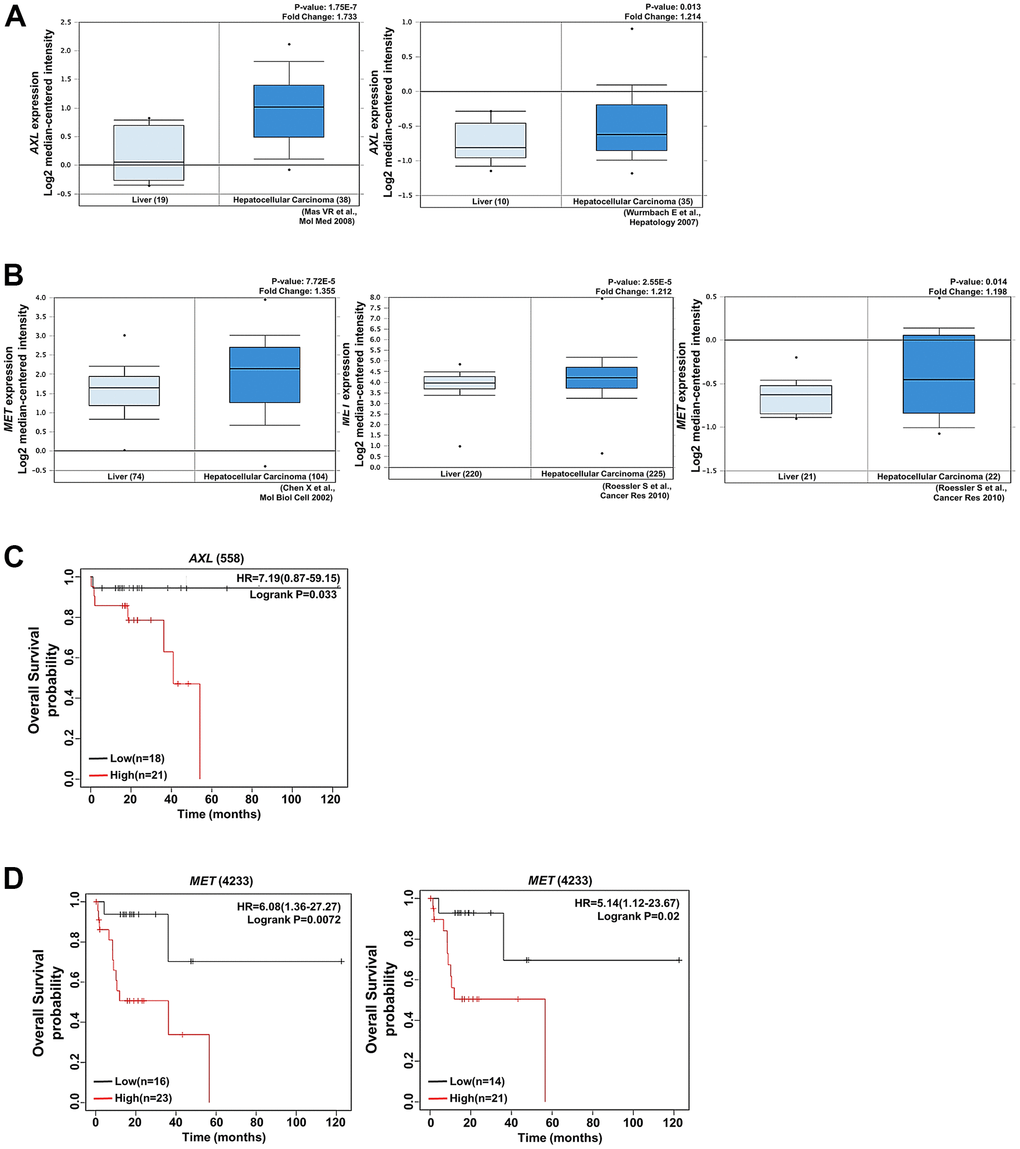 Details regarding Galectin-1, AXL, and MET expression in patients with HCC were obtained from the TCGA database by using the UALCAN data analysis portal (http://ualcan.path.uab.edu/) and subsequently analyzed. We conducted a Kaplan–Meier survival analysis for patients with HCC by using the PrognoScan database (http://dna00.bio.kyutech.ac.jp/PrognoScan/) based on the differential expression of Galectin-1, AXL, and MET.