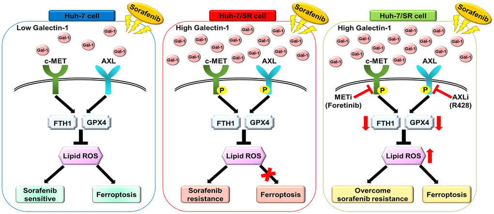 In this study, we determined whether Galectin-1 expression is correlated with sorafenib resistance in HCC cells. Our results indicate that the inhibition of Galectin-1 expression and the resulting suppression of ferroptosis marker expression (i.e., GPX4 and ferritin heavy chain 1 (FTH1)) led to excessive lipid peroxidation and triggered ferroptosis. In addition, Galectin-1 increased AXL receptor tyrosine kinase (AXL) and proto-oncogene receptor tyrosine kinase (MET) phosphorylation, which induced sorafenib resistance and affected sorafenib-mediated ferroptosis in HCC cells. The present study demonstrates that Galectin-1 induces sorafenib resistance in HCC cells through MET and AXL signaling and reveals a new link between Galectin-1 signaling and sorafenib-mediated ferroptosis.