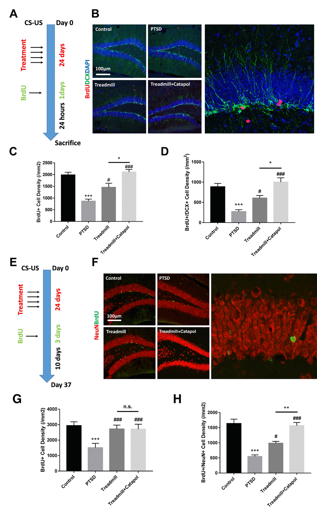 Catalpol promoted neural differentiation without changing the survival of the immature neurons. (A, E) experimental procedure of different BrdU injection protocol. (B) DCX staining (green) coupled with BrdU (red) in DG to assess the NSCs neural differentiation. (C, D) Statistical analysis of the BrdU positive cell and BrdU/DCX dual positive cells in DG region. (F) NeuN staining (red) coupled with BrdU (green) in DG to assess the neural maturation in DG. (G, H) Statistical analysis of the BrdU positive cell and BrdU/NeuN dual positive cells in DG region. One-way ANOVA, ***p < 0.001 vs. control; #p < 0.05, ###p < 0.001.