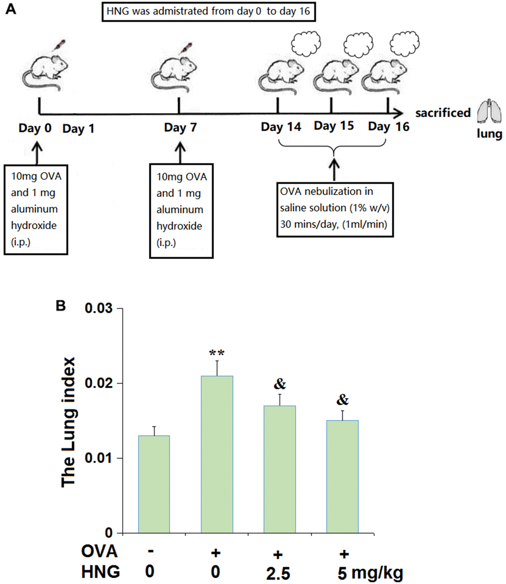 The outline of the experimental protocol is displayed in Figure 1A. OVA-induced inflammation features significant lung edema due to severe lung injury, so, the lung weight index was determined in this study. After treatment, animals were sacrificed to calculate the lung weight index. We found that the lung weight index (Figure 1B) in OVA-challenged mice was extremely elevated from 0.013 to 0.021, then dramatically declined to 0.017 and 0.015 by 2.5 mg/kg and 5 mg/kg HNG, respectively.