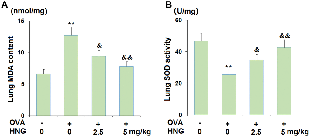 Oxidative stress is reportedly observed during the pathogenesis of asthma [25], which was investigated in each animal. Compared to the vehicle group, the pulmonary MDA content (Figure 2A) was greatly increased from 6.6 nmol/mg protein to 12.7 nmol/mg protein in OVA-challenged mice but dramatically reduced to 9.4 and 7.8 nmol/mg protein by 2.5 mg/kg and 5 mg/kg HNG, respectively. Furthermore, the pulmonary SOD activity (Figure 2B) in the vehicle, OVA, OVA+ 2.5 mg/kg HNG, and OVA+ 5 mg/kg HNG groups was 46.9, 25.6, 34.6, and 42.6 U/mg wet tissue, respectively. These data suggest that the OVA-induced oxidative stress in mice was ameliorated by HNG.