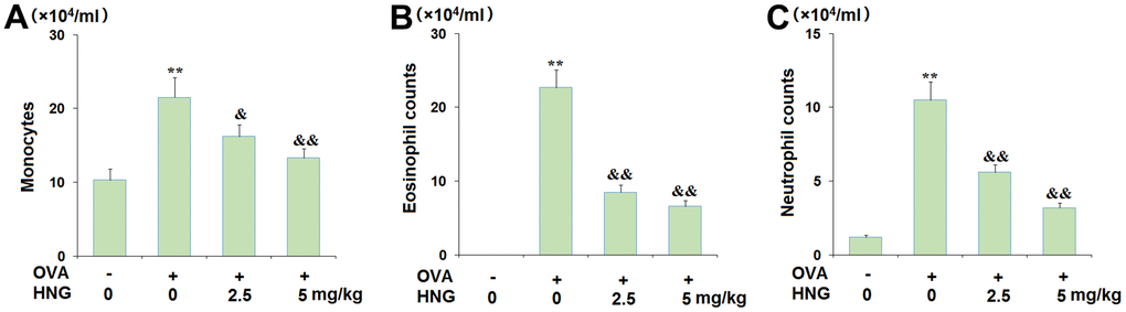 Subsequently, the infiltration of inflammatory cells in the BALF of each animal was investigated. The total monocytes (Figure 3A) in the vehicle, OVA, OVA+ 2.5 mg/kg HNG, and OVA+ 5 mg/kg HNG groups were 10.3×104/mL, 21.5×104/mL, 16.2×104/mL, and 13.3×104/mL, respectively. The number of eosinophils (Figure 3B) in OVA-challenged mice was extremely increased from 0 to 22.7×104/mL but greatly decreased to 8.5×104/mL and 6.6×104/mL by 2.5 mg/kg and 5 mg/kg HNG, respectively. Moreover, the neutrophil counts (Figure 3C) in the vehicle, OVA, OVA+ 2.5 mg/kg HNG, and OVA+ 5 mg/kg HNG groups were 1.2×104/mL, 10.5×104/mL, 5.6×104/mL, and 3.2×104/mL, respectively. These results reveal that the infiltration of inflammatory cells in the BALF of OVA-challenged mice was inhibited by HNG, but as shown in Figure 3D, there was no significant difference between the groups.