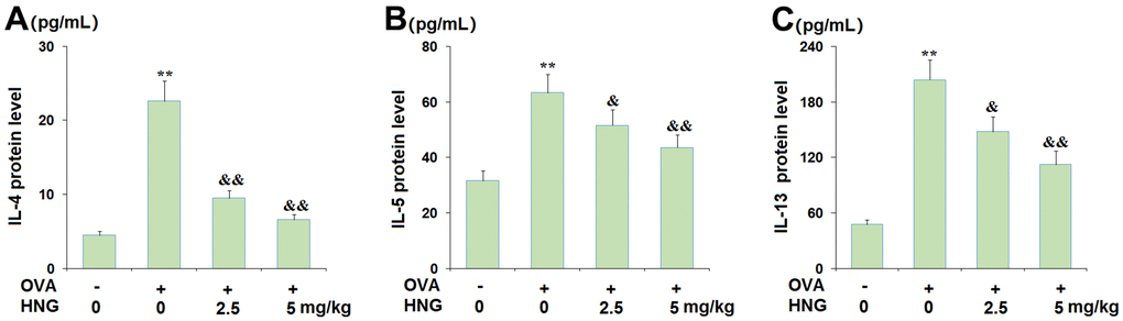 HNG inhibited the expression of the Th2 cytokines IL-4, IL-5, and IL-13 from BALF