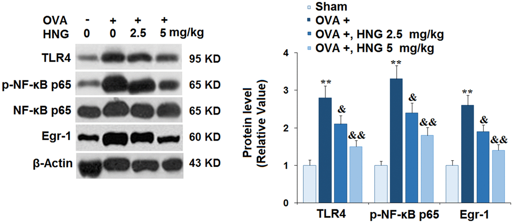 TLR4/NF-κB [26] and Egr-1 signaling [27] are reportedly involved in the pathogenesis of airway inflammation. We found that TLR4, p-NF-κB p65, and Egr-1 (Figure 6) were dramatically upregulated in OVA-challenged mice, then greatly repressed by 2.5 mg/kg and 5 mg/kg HNG. Consistently, HNG reduced the expression of TLR4 and Egr-1 at the mRNA levels (Supplementary Figure 2). These results suggest that the activation of TLR4/NF-κB and Egr-1 signaling in OVA-challenged mice was abolished by HNG.