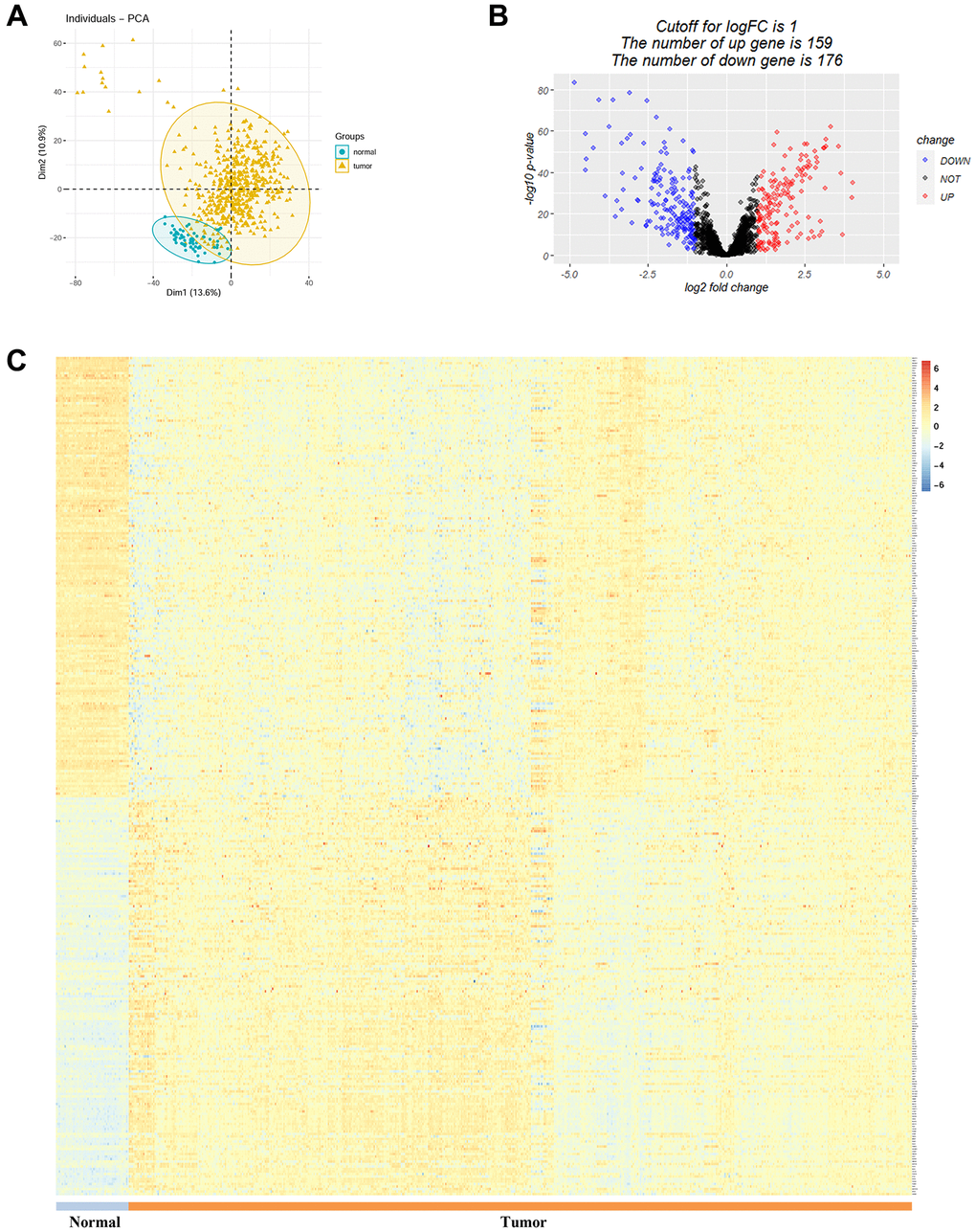 A total of 2093 TRGs were acquired from TelNet. The expression of these genes was compared between TCGA-LUAD tumor tissues and normal controls. PCA plot showed discrete scatter points of the two groups (Figure 1A). Among the 2093 TRGs, 335 were significantly differentially expressed in LUAD (|logFC| >1 and adjusted P value < 0.01). Among these, 159 were up-regulated and 176 were down-regulated (Figure 1B). The detailed expression information of the 2093 TRGs were available in Supplementary Table 1 and Figure 1C.