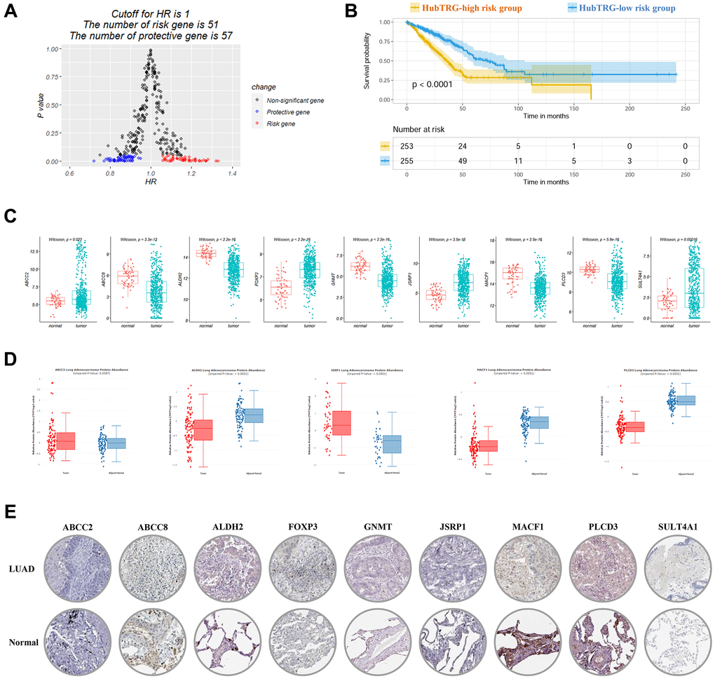 As shown in Supplementary Table 2, K-M method revealed 86 TRGs that were correlated with survival and univariate COX regression revealed 108 TRGs with P < 0.05. Among the 108 TRGs, 51 were risk genes with HR > 1 and 57 were protective with HR < 1 (Figure 2A). There were 74 genes that were overlapped in the results of the two methods. Then 19 out of 74 genes were screened by using Lasso regression. With further stepwise selection, a total of 9 hubTRGs were finally identified (Table 1). Using multivariate COX regression analysis, the TRG risk score were calculated with the following formula: ABCC2 × 0.0411 – ABCC8 × 0.0785 – ALDH2 × 0.1519 – FOXP3 × 0.1557 – GNMT × 0.1039 – JSRP1 × 0.0862 – MACF1 × 0.214 + PLCD3 × 0.1535 – SULT4A1 × 0.0562. The TRG risk score of patients in the TCGA-LUAD cohort was computed, and the patients were divided into high and low risk groups based on each patient’s median TRG risk score value. The K-M curve was plotted and shown in Figure 2B. The hubTRG-high risk group had significantly worse survival outcome as compared with low risk group (median survival: 35.8 versus 72.5 months, P < 0.0001). The mRNA expression and protein levels were shown in Figure 2C–2E.