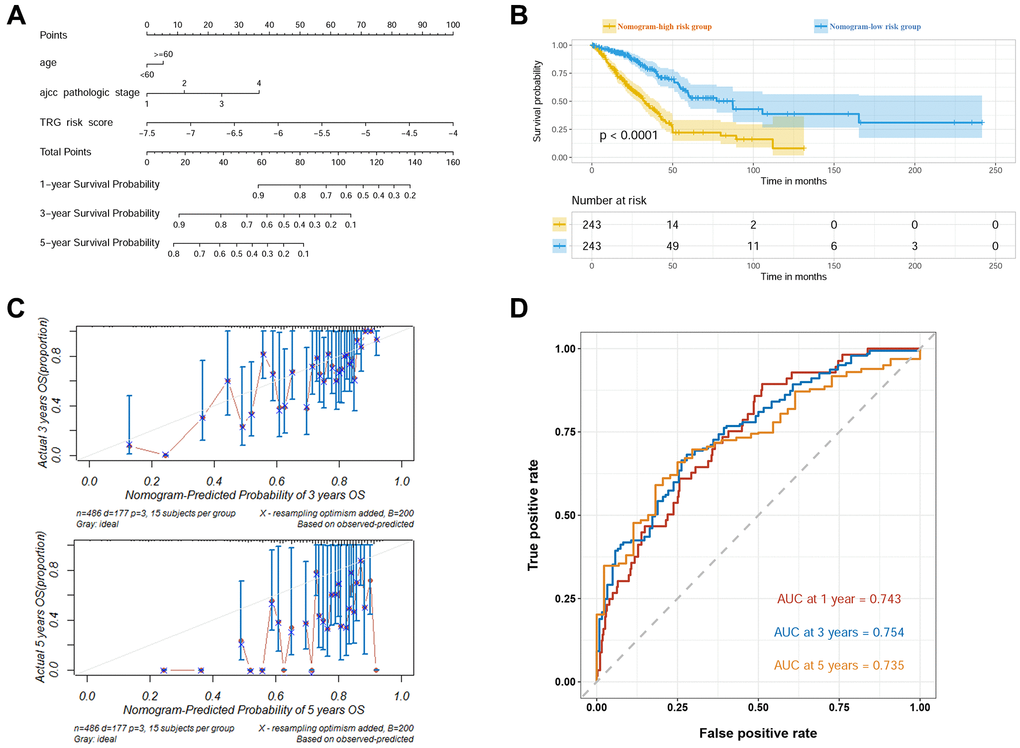As the final TRG risk model, a nomogram was constructed based on the TRG risk score, age and AJCC pathologic stage (Figure 3A). In the nomogram, the coefficiency values of TRG risk score, age and AJCC pathologic stage were 0.9816, 0.1828 and 0.4197, respectively. Based on the nomogram, the patients in the TCGA-LUAD cohort were divided into high and low risk groups and K-M curve revealed significantly reduced survival in high risk group (Figure 3B). The calibration curves showed good fitting of predicted survival and actual survival at 3 years and 5 years (Figure 3C). The ROC curves at 1, 3 and 5 years were plotted and the AUROC values were 0.743, 0.754 and 0.735, respectively (Figure 3D).