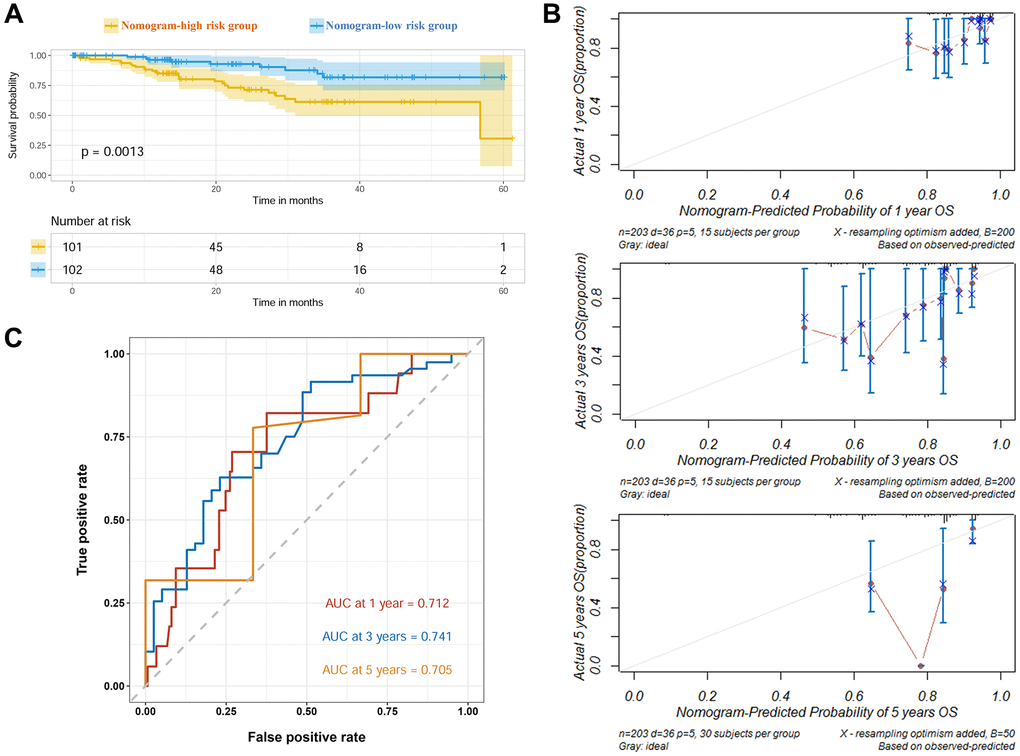 To further evaluate the accuracy of the nomogram, it was validated in an external CPTAC-LUAD cohort. The nomogram-divided risk groups showed significantly different survival within 60 months follow-up (Figure 4A). The calibration curves showed fitting of predicted survival and actual survival at 1 year, 3 years and 5 years (Figure 4B). The AUROC values at 1, 3 and 5 years were 0.712, 0.741 and 0.705, respectively (Figure 4C). In brief, the nomogram based on TRG risk score performed well in predicting prognosis of LUAD patients in both the training set and validation set.