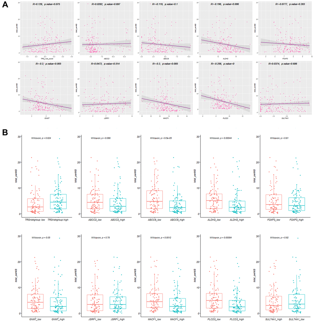 The TRG risk score showed a positive correlation with the TMB (R = 0.129, P = 0.075, Figure 5A). The patients in the high TRG risk score group showed a higher TMB (P = 0.024) than those in the low risk group (Figure 5B). The correlation of 9 hubTRGs with TMB were also presented in Figure 5.