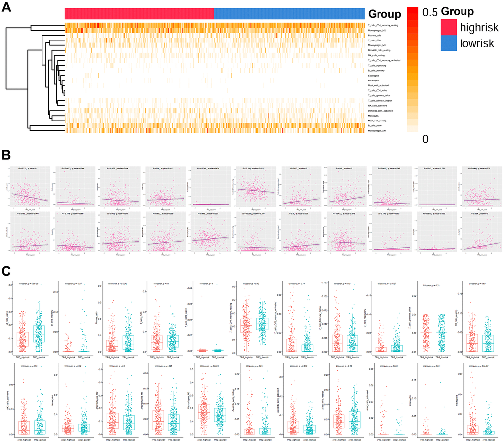 The infiltration status of 22 types of immune cells was evaluated high and low TRG risk groups (Figure 6A). The infiltration of 14 types of immune cells were significantly correlated with TRG risk score (P < 0.05, Figure 6B), while 7 types of immune cells showed significant difference between high and low TRG risk groups (P < 0.05, Figure 6C).