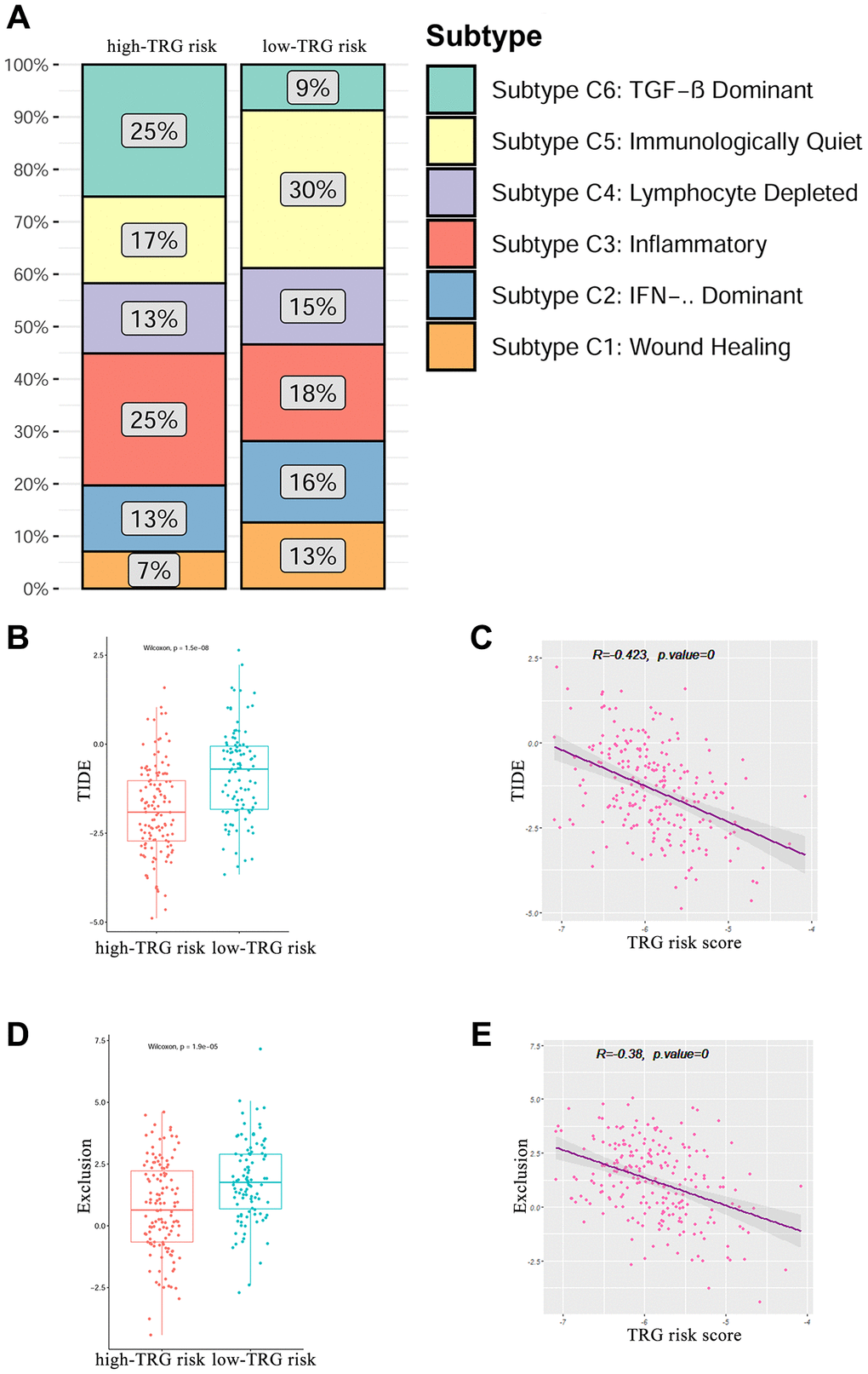 In previous research, the cancers of each individual in the TCGA database have been clustered into six subtypes based on the immune status: C1 (wound healing), C2 (IFN-g dominant), C3 (inflammatory), C4 (lymphocyte depleted), C5 (immunologically quiet), and C6 (TGF-b dominant) [21]. We analysed the immune subtypes in high and low TRG risk groups. The results showed that high TRG risk group had a higher proportion of C3 (25%) and C6 (25%) subtypes and a lower proportion of C1 (7%), C2 (13%), C4 (13%) and C5 (17%) subtypes than the patients in the low risk group (P = 0.005, Figure 7A).