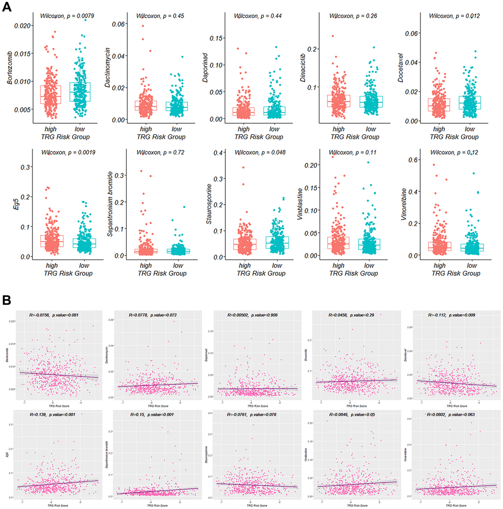 The top ten drugs with the least IC50 values were identified: Bortezomib, Dactinomycin, Docetaxel, Daporinad, Sepantronium bromide, Vinblastine, Eg5, Staurosporine, Vinorelbine and Dinaciclib. Among these drugs, the IC50 values of Bortezomib, Docetaxel and Staurosporine in the high TRG risk group were significantly lower than in the low risk group, while Eg5 had a significantly higher IC50 value in the high TRG risk group (Figure 8).