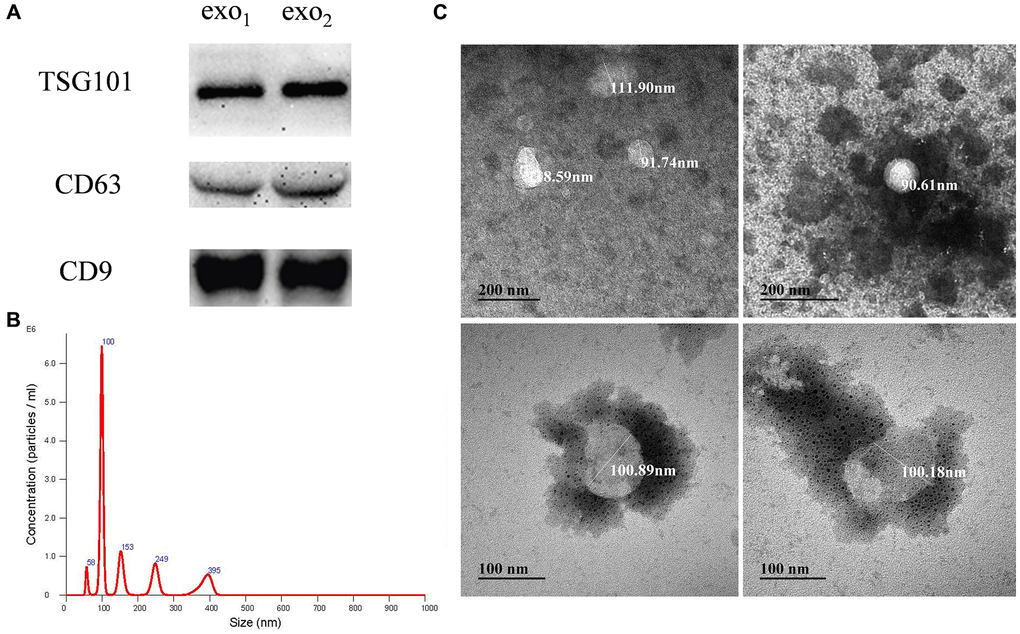 At room temperature, 10 μl of the extracted exosome sample was added dropwise to the TEM copper grids and left for 1 min before blotting up the solution with filter paper. A further 10 μL of 3% phosphotungstic acid solution was added dropwise to each copper mesh for negatively staining for 1 min before blotting up. The copper grids were placed in a six-well plate that was put overnight in an oven at 70°C. The morphology of the exosomes after negative staining was observed by TEM and images were taken.
