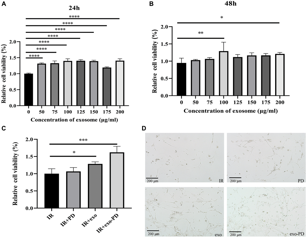 Human normal small intestine cell line (HIEC-6) was cultured by using Opti-MEM (1×) Reduced Serum Medium (containing 4% fetal bovine serum, 20 mM Hepes, 10 mM Glutamax, 10 ng/ml EGF) in an incubator set at 37°C with saturated humidity and 5% CO2. When the HIEC-6 cells grew to about 80% density, cells were counted and passed into 96-well plates with 5000 cells per well, divided into 8 groups: IR group, 50 μg/ml group, 75 μg/ml group, 100 μg/ml group, 125 μg/ml group, 150 μg/ml group, 175 μg/ml group and 200 μg/ml group. The 96-well plates would be irradiated with a total dose of 8 Gy at 1 Gy/min under a Bio-X-ray irradiator. After irradiation, the cell medium would be exchanged and the exosome solution was added to each group. After 24 h and 48 h of incubation, the cell viability of the IR group, IR+PD group, IR+exo group and IR+exo-PD group were then measured with CCK-8.