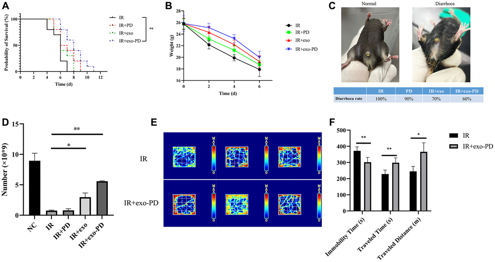 Male mice at 6–8 weeks were divided into four groups (10 mice each) and given a lethal dose of 16 Gy (dose rate 1.5 Gy/min) of abdominal irradiation. Then they were given different treatments to observe survival times. Figure 4A shows that the mean survival time in the IR group was 5.7 d, with a median survival time of 6 d. While the mean survival time in the exo-PD group was 8.1 d, with a median survival time of 8 d (p = 0.001). Also, changes of body weight, diarrhea, leukocyte and behavioral in the mice due to radiation were recorded. As shown in Figure 4B, mice in the IR group had the fastest weight loss, from a mean of (25.76 ± 0. 86) g to (17.9 ± 1.08) g, 30.51% loss in 6 days. In contrast, the exo-PD group lost 22.62% of their body weight from (25.82 ± 1. 19) g to (19.98 ± 0. 97) g in 6 days. As shown in Figure 4C, without intervention, all the irradiated mice would have developed diarrhea on the fourth day. In contrast, PD group, the exo group and the exo-PD group could reduce the diarrhea rate appropriately. Among them, the exo-PD group could significantly alleviate the diarrhea in mice. Since most of the mice would die on day 6, the weight changes had been recorded until the end of day 6. Figure 4D shows that the normal mouse leukocyte count was (8.49 ± 1.24) × 109, which decreased to (0.755 ± 0.092) × 109 on the fourth day after irradiation, while the exo-PD group was (5.58 ± 0.071) × 109. In order to observe the behavioral changes in mice after irradiation and to show the activity and stress response of mice after irradiation, the open field test in the IR group and IR+exo-PD group had done. Figure 4E and 4F show that mice in the IR+exo-PD group showed a significant increase in horizontal movement time (p < 0.01) and distance (p < 0.05) and a significant decrease in central compartment dwell time (p < 0.001) compared to mice in IR group, indicating that mice given the IR+exo-PD group were more active and had an increased desire to explore.