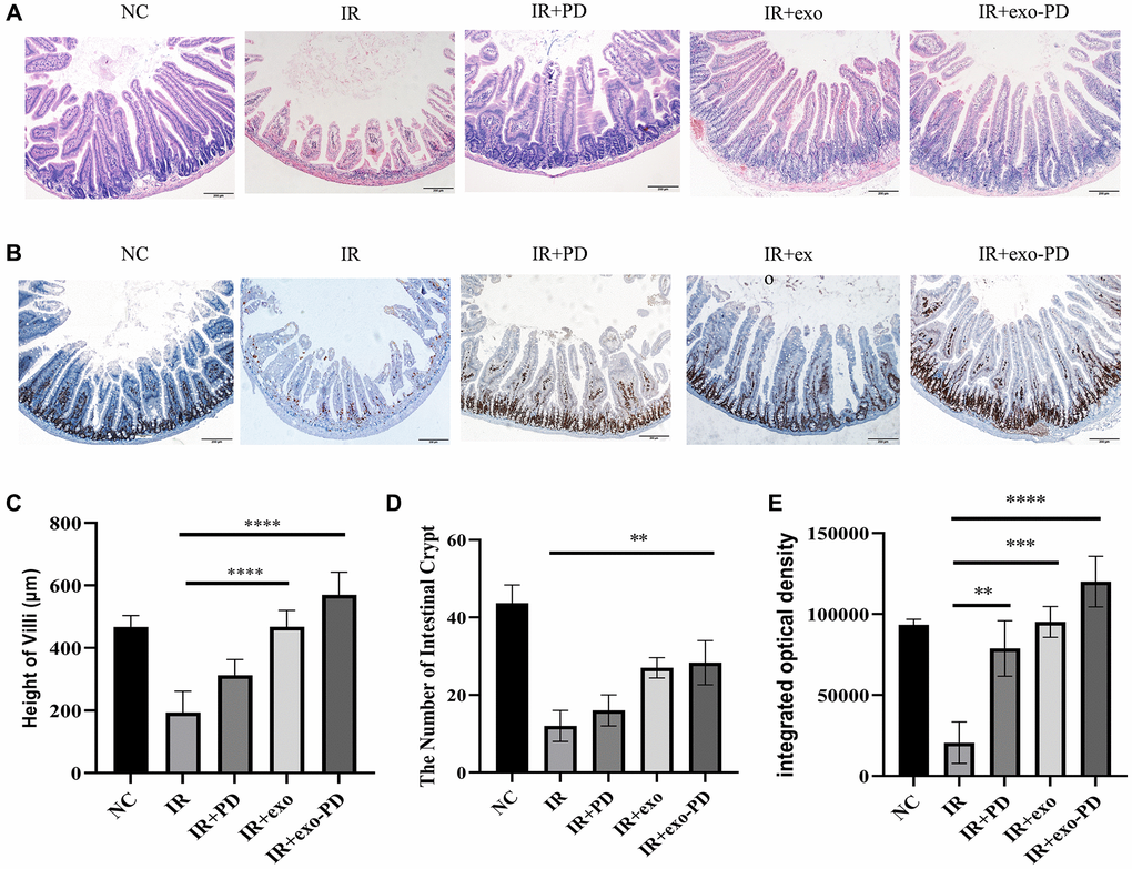 Intestinal stem cells are located at the base of the intestinal crypts and play an important role in the stabilization and renewal of the intestinal epithelial lining. Ki67 immunohistochemistry was performed on intestinal tissues. As shown in Figure 5B and 5E, the integrated optical density (IOD) values of Ki67+ cells in the IR group were significantly lower than those in the NC, IR+PD, IR+exo and IR+exo-PD groups. Consistent with the HE results, the IR group had low crypt numbers and abnormal morphology, and intestinal cell renewal was impaired, while PD, exo, and exo-PD could protect the mouse intestine and promote the recovery of intestinal cells.