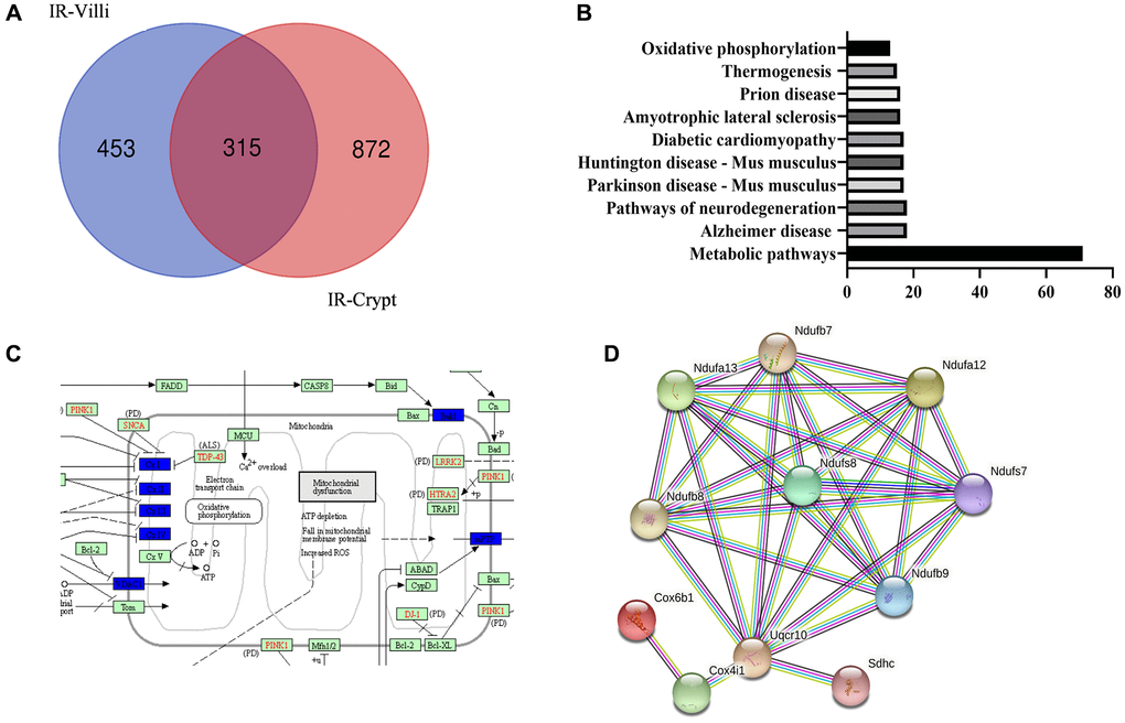 Since the protein spectra of intestinal villi and crypts of mice before and after irradiation were made in the previous laboratory, we had obtained the differential proteins of intestinal villi and crypts of mice 6 h after irradiation. So we made Venn diagrams of the differential proteins to find out the proteins that were jointly reduced and increased by intestinal villi and crypts. As shown in Figure 6A and 6B, intestinal villi were screened for a total of 315 common differential proteins. GO enrichment analysis of the common proteins revealed that they were mostly enriched in various metabolic pathways.