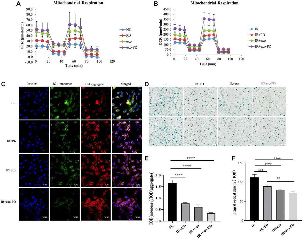 Ionizing radiation is one of the causes of mitochondrial damage, which leads to stem cell senescence and death [26–28], thus impairing stem cell self-renewal and differentiation [29]. As shown in Figure 7D and 7F, PD, exo and exo-PD reduced cellular senescence caused by irradiation and normalized the rate of intestinal cell renewal compared to the IR group, consistent with the results of the previous experiments that increased cell viability.
