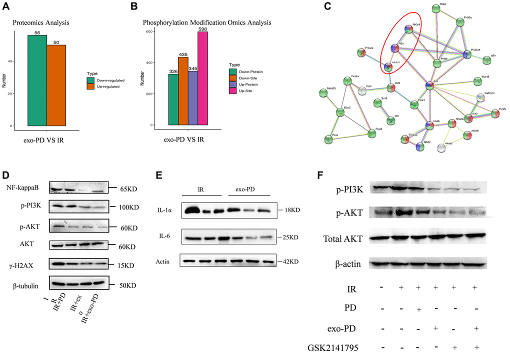 In order to find specific targets of exo-PD affecting mitochondria, we considered that mitochondrial oxidative respiratory proteins may be related to molecular phosphorylation. We subsequently collected HIECs with treating of 8 Gy irradiation and exo-PD incubation. Proteomics and phosphorylated proteomic modifications were examined. As shown in Figure 8A and 8B, 106 differential proteins, 671 phosphorylated differential proteins and 1033 phosphorylated differential sites were obtained. We then identified mitochondrial oxidative respiration-related proteins and proceeded to do STING protein interactions, shown in Figure 8C. Several possible pathways were derived: PI3K-AKT signaling pathway, NF-kappaB pathway, AMPK pathway and CDK1-ATM-sirt2 pathway, etc. After long deliberation, we explored whether exo-PD improves mitochondrial function in intestinal cells and affects cellular status through the PI3K-AKT signaling pathway.