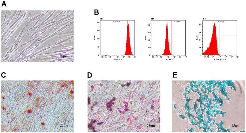 Under light microscopy, hUMSCs of the 4th-5th generation grew with a fibroblast-like morphology (Figure 1A). Flow analysis results showed that hUMSCs were positive for surface markers CD105 (99.98%), CD34 (00.41%), and HLA-DR (00.45%) (Figure 1B). After 21 days of induction of osteogenic differentiation, brownish-red opaque calcium nodules were visible by Alizarin Red staining (Figure 1C). After induction of adipogenic differentiation, Oil Red staining showed purple-red lipid droplets distributed in the cytoplasm (Figure 1D). MSC mass induced by chondrogenic differentiation in suspension culture and Alcian Blue staining after frozen section show endoacidic mucopolysaccharides in cartilage tissue (Figure 1E). These results indicated that hUMSCs were successfully identified.