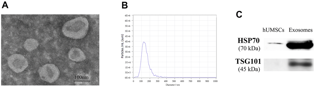 After hUMSCs reach about 80% confluence, the supernatant was collected. Exosomes were extracted after binding, washing, and elution with differential centrifugation, according to the protocol of exosome extraction kit (Rengen Biosciences, EXOCon40-10). Exosomes were validated according to previous studies [23]. 50-100μl 2% paraformaldehyde solution was used to dissolve exosomes, and photos were taken with an electron microscope. The quantity and size of exocrine granules (Zeta View PMX110) and the movement of particles (NTA software, ZetaView 8.02.28) were measured. Exosomal markers HSP70, and TSG101 (Abcam) were determined using western blotting.