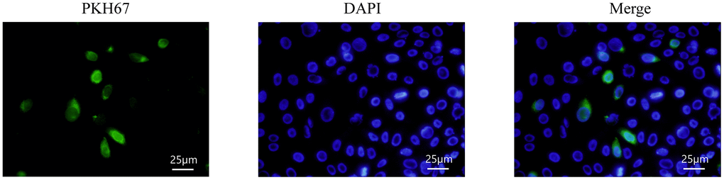 HMrSV5 with 40% confluence are cultured with exosomes derived from hUMSCs labeled by PKH67. After 6 hours of culture, the cells were washed 3 times with PBS, and then fixed with 4% PFA for 10 minutes at room temperature. The cells were washed with PBS again and incubated with DAPI for 5 min under protection from light. Finally, the uptake of exosomes by HMrSV5 was observed under an inverted fluorescence microscope using a 40× objective lens.