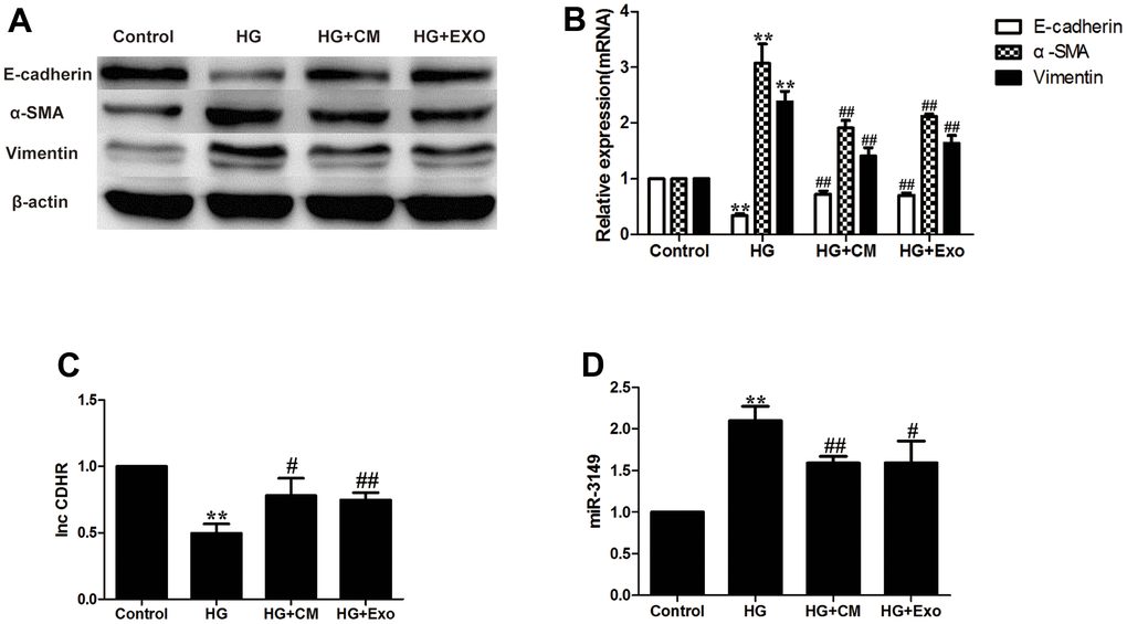 According to the results, addition of 7.5% hUMSC-CM to the HG group alleviated HMrSV5 EMT. EMT in HG + hUMSC-Exos group was also alleviated, which proved that hUMSC-CM improves HG-induced peritoneal EMT via exosomes (Figure 4A, 4B). Based on our previous exploration, we found that miR-3149 and in-CDHR were also affected by the progression of EMT. HUMSC-CM and hUMSC-Exos can reverse the down-regulation of lnc-CDHR and up-regulation of miR-3149 in the EMT model (Figure 4C, 4D).