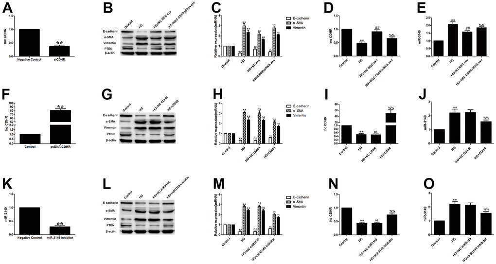 To prove that hUMSC-Exos eased EMT by delivering lnc-CDHR to HMrSV5, hUMSCs were transfected with lnc-CDHR siRNA. Exosomes extracted from transfected stem cells were shown to be successfully transfected (Figure 5A). Compared to the HG group, NC MSC exosomes improved the progression of EMT, and PTEN expression was elevated. However, the beneficial effects of hUMSC-Exos were all blocked after treatment of HG-induced HMrSV5 with MSC CDHR siRNA exosomes (Figure 5B, 5C). Furthermore, PCR detection of lnc-CDHR and miR-3149 expression in each group evidenced that low expression of CDHR in exosomes caused high expression of miR-3149 in HMrSV5, which means that the inhibitory effect of lnc-CDHR on miR-3149 was removed (Figure 5D, 5E).