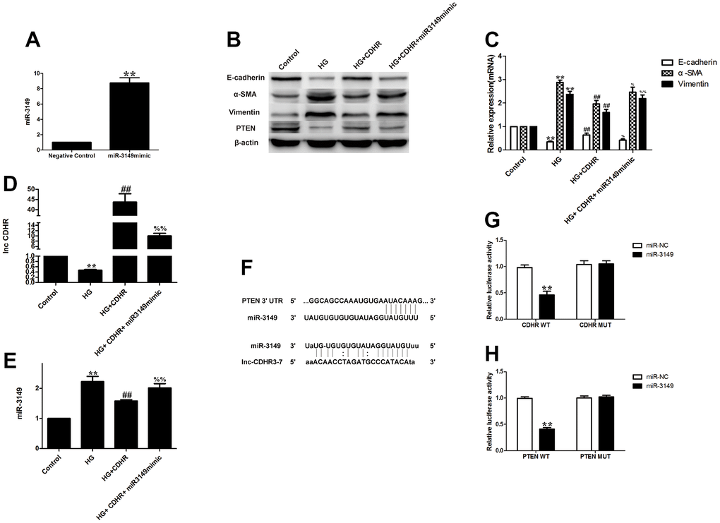 To figure out the upstream and downstream relationship between lnc-CDHR and miR-3149, we implemented a rescue experiment. Simultaneous transfection of lnc-CDHR (Figure 5F) and miR-3149 mimic (Figure 6A) into HG-induced HMrSV5 resulted in lnc-CDHR decreasing Vimentin and α-SMA and increasing E-cadherin expression, while elevating PTEN expression (Figure 6B, 6C). In addition, lnc-CDHR inhibited the expression of miR-3149 (Figure 6D, 6E). However, the mitigating effects of lnc-CDHR on EMT were all reversed by miR-3149, demonstrating that lnc-CDHR is located upstream of miR-3149.