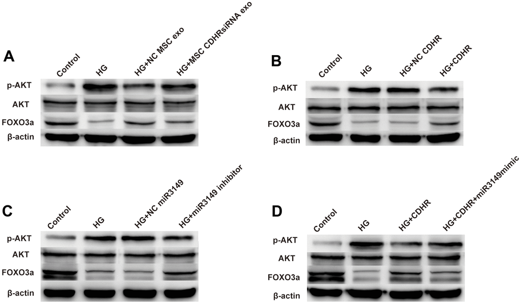 Compared with the control group, HG treatment increased the ratio of pAKT/AKT and decreased the expression of FOXO3a, indicating that HG induced EMT through AKT/FOXO signaling pathway. Compared to the HG group, exosomes alleviated the decrease in FOXO3a protein levels, suggesting that hUMSC-Exos alleviated EMT through the AKT/FOXO signaling pathway. However, this alleviating effect was impeded by the reduced lnc-CDHR in the CDHR siRNA group, indicating that exosomal lnc-CDHR can relieve EMT via the AKT/FOXO signaling pathway (Figure 7A). Overexpression of lnc-CDHR in HMrSV5 also achieved mitigation of EMT, further validating that AKT/FOXO signaling pathway mediated the remission of EMT by lnc-CDHR (Figure 7B). To explore the relationship between miR-3149 and AKT/FOXO signaling pathway, transfection of miR-3149 inhibitor to HMrSV5 resulted in a distinct reduction in pAKT/AKT and an elevation in protein FOXO3a expression, indicating that AKT/FOXO signaling pathway also mediated the alleviating effect of miR-3149 on EMT (Figure 7C). Finally, to confirm the relationship between lnc-CDHR and miR-3149 on the AKT/FOXO signaling pathway, transfection of both lnc-CDHR and miR-3149 mimic to HMrSV5 resulted in lnc-CDHR alleviating the activation of the AKT/FOXO pathway, and this relief was reversed by miR-3149, demonstrating that lnc-CDHR adsorbed miR-3149 to alleviate EMT through the AKT/FOXO signaling pathway (Figure 7D). These results imply that hUMSC-Exos attenuated peritoneal EMT through regulation of the AKT/FOXO signaling pathway.