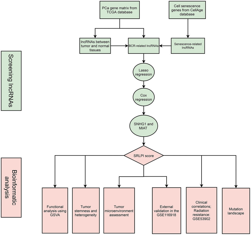Stress-induced permanent, irreversible cell cycle arrest known as cellular senescence causes a reduction in cellular processes such proliferation, migration, homing, and differentiation [8, 13–17]. Senescence brings about a number of abnormalities in the human body that have been demonstrated to hasten aging, cause carcinogenesis, and promote the spread of cancer [1]. Furthermore, aging is an established risk factor for many tumors [18, 19]. Therefore, it is crucial to investigate the intersections between aging and cancer and look for new ways to heal those intersections in order to combat malignancies that are linked to aging. Long non-coding RNAs (lncRNAs), a category of non-coding RNAs longer than 200 nucleotides, can regulate the expression of protein-coding genes and have come to light in recent years as having significant involvement in a number of biological processes related to human diseases, including PCa [20–25]. In our earlier researches, we discovered certain senescence-related biomarkers linked to PCa patients’ prognosis [8, 14, 15], but the potential effects of lncRNAs associated with senescence-related genes on this disease have not been reported. Thus, in this study, we established a senescence-related lncRNA prognostic index (SRLPI) to predict BCR risk and radiosensitivity for PCa patients.