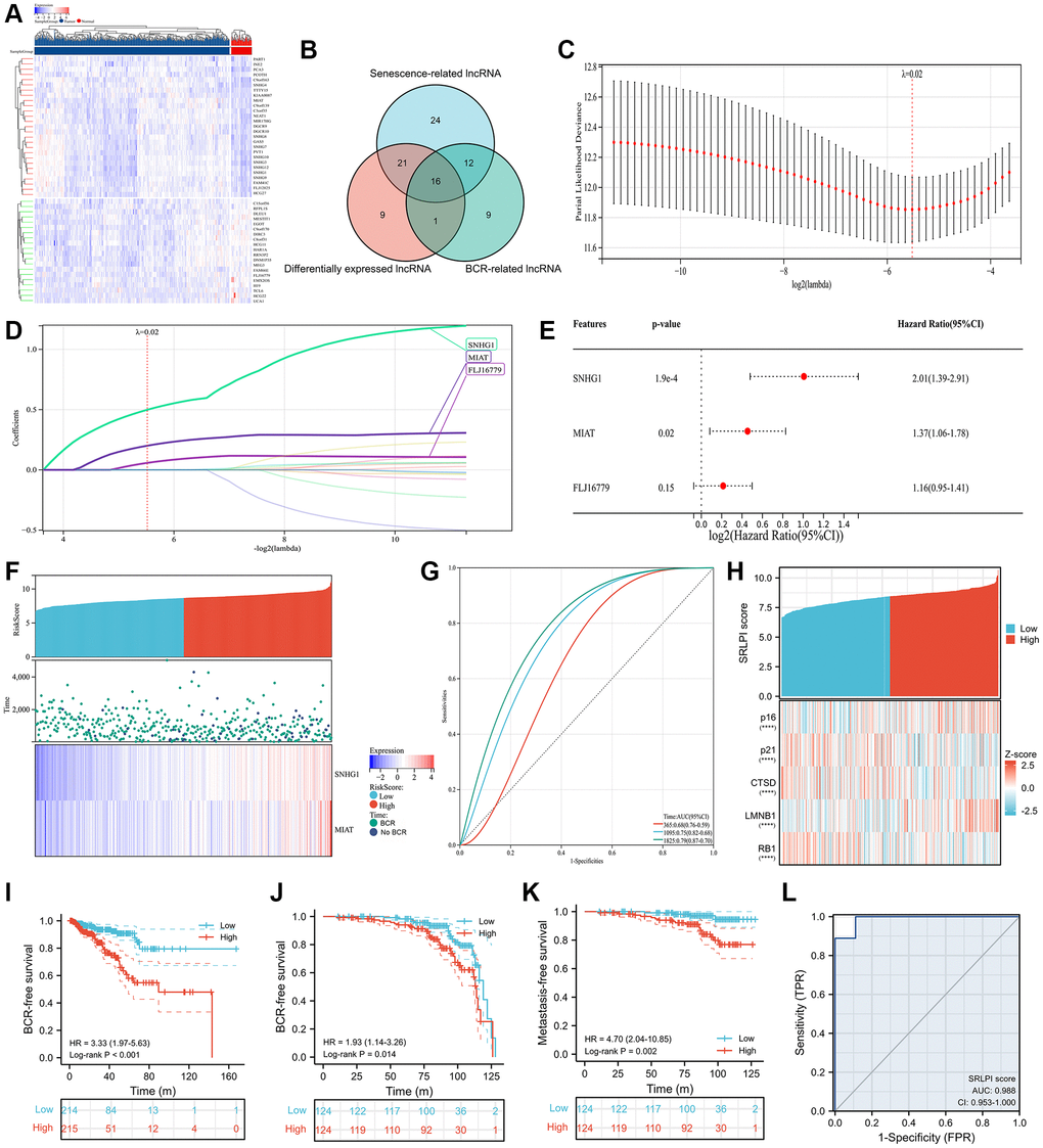 We downloaded 279 genes responsible for cellular senescence in humans from the CellAge database (http://genomics.senescence.info/cells) which was based on gene manipulation experiments in different human cell types [26]. The PCa gene matrix and clinical characteristics from our prior work were used in The Cancer Genome Atlas (TCGA) database [10]. We examined differentially expressed lncRNAs and lncRNAs associated with BCR. Differential expression was defined as when Padj was less than 0.05 and the fold change absolute value was larger than 1.5. The senescence-related lncRNAs were calculated using a Pearson analysis, and the requirements were that the P value be less than 0.5 and the absolute value of the coefficient be greater than 0.4. A Pearson analysis was used to determine the senescence-related lncRNAs, and the P value and absolute value of the coefficient had to be less than 0.5 and more than 0.4, respectively. 430 samples from the TCGA database were examined, and the log-rank test for BCR-free survival yielded a p value less than 0.05. We discovered the lncRNAs that were used to build the SRLPI score after the intersection of differentially expressed BCR-related, senescence-related, and lncRNAs. We then performed lasso and multivariate Cox regression analysis. The prognostic and clinical values of SRLPI in 430 PCa patients in TCGA database were analyzed, which was confirmed by the GSE116918 [27] and GSE70768 [28]. Additionally, in order to determine the prognostic role of the SRLPI score, we graded the PCa patients in TCGA database or GSE116918 [27] based on the European Association of Urology (EAU) [29] and National Comprehensive Cancer Network (NCCN) guidelines [30] and further compared these factors using Cox regression analysis in terms of BCR-free survival. The diagnostic ability of SRLPI for radiosensitivity was analyzed by the GSE53902 [31]. Furthermore, we explored the relationship between SRLPI score and senescence markers, including p16, p21, CTSD, LMNB1 and RB1, based on the previous study [32].
