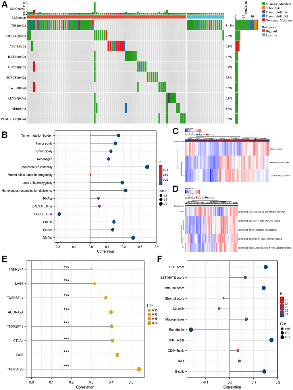 The top gene between high- and low- SRLPI groups was tumor protein P53 (TP53) with statistical significance (Figure 3A). For tumor heterogeneity and stemness, SRLPI score was positively related to MSI, HRD, LOH, TMB, tumor purity, tumor ploidy, DMPss, ENHss and DNAss, but was negatively associated with EREG.EXPss with statistical significance (Figure 3B). Protein secretion and androgen response were found to be substantially enriched for the signature gene set enrichment in the low-SRLPI group, whereas E2F targets were found to be strongly enriched in the high-SRLPI group (Figure 3C). For pathway analysis, the fatty acid cycling model, mitochondrial uncoupling, disorders of base excision repair, and tRNA modification in the mitochondrion were substantially enriched in the high-SRLPI group, whereas attachment of glucose-6-phosphate isomerase anchor to urokinase plasminogen activator surface receptor was strongly enriched in the low-SRLPI group (Figure 3D).