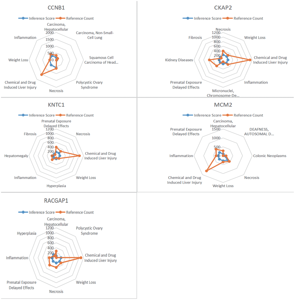 Core genes were entered into CTD to find diseases related to core genes. Five genes (KNTC1, MCM2, CKAP2, RACGAP1, CCNB1) were found to be associated with head and neck squamous cell carcinoma, necrosis, inflammation and hepatomegaly (Figure 10).