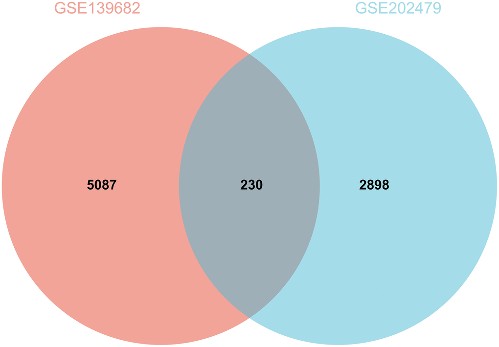 230 DEGs were identified according to the matrix of GSE139682 and GSE202479 (Figure 1A is the result of GSE139682, Figure 1B is the result of GSE202479, Figure 2).