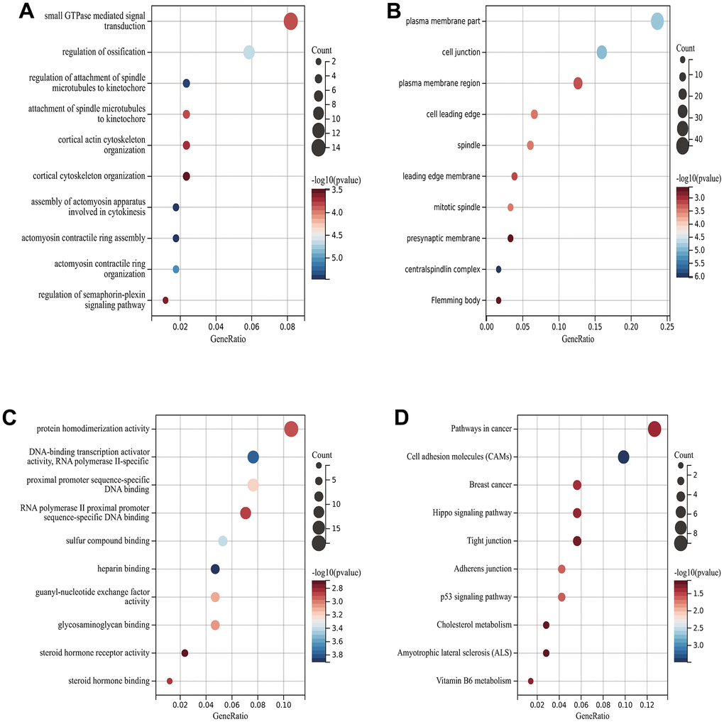 We analyzed DEGs by GO and KEGG. According to GObp analysis, they were mainly concentrated in the regulation of ossification, the regulation of spindle microtubule and centromere attachment, and the cytoskeleton tissue of cortical actin (Figure 3A). According to GOcc analysis, they are mainly concentrated in the plasma membrane part, cell junction, plasma membrane region and anterior membrane (Figure 3B). According to GOmf analysis, they are mainly enriched in protein homodimerization activity, proximal promoter sequence-specific DNA binding and sulfur compound binding (Figure 3C).