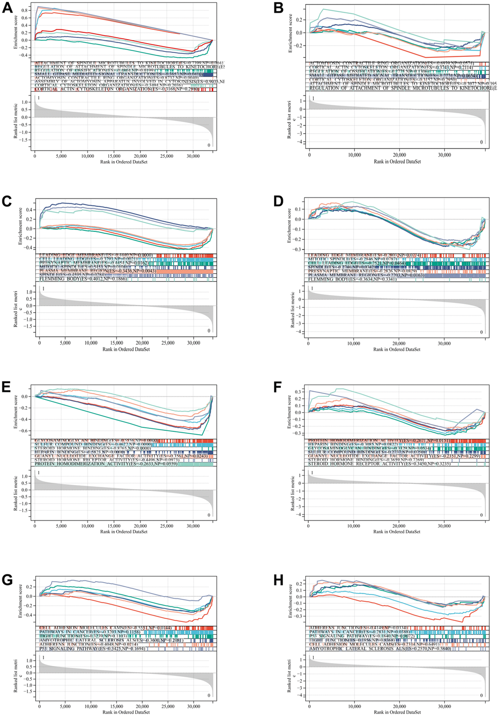 GSEA was performed to search for possible enrichment items among non-differentially expressed genes, and results of DEGs were verified. The intersection of enrichment items and GOKEGG enrichment items of differentially expressed genes is shown in the figure, which is mainly concentrated in Hippo signal pathway, p53 signal pathway and cancer pathway. (Figure 4A, 4C, 4E, 4G are GSE139682 results, while Figure 4B, 4D, 4F, 4H are GSE202479 results).