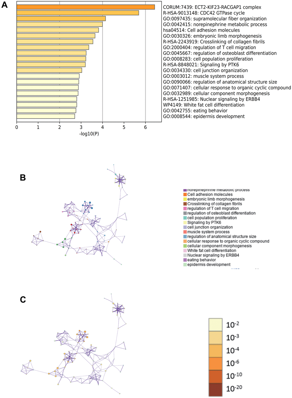 In the enrichment project of Metascape, GO has the regulation of supramolecular fibrous tissue, norepinephrine metabolism and T cell migration (Figure 5A), and an enrichment network stained by enrichment term and p-value (Figures 5B, 5C, 6), which visually shows the correlation and confidence of each enrichment item.
