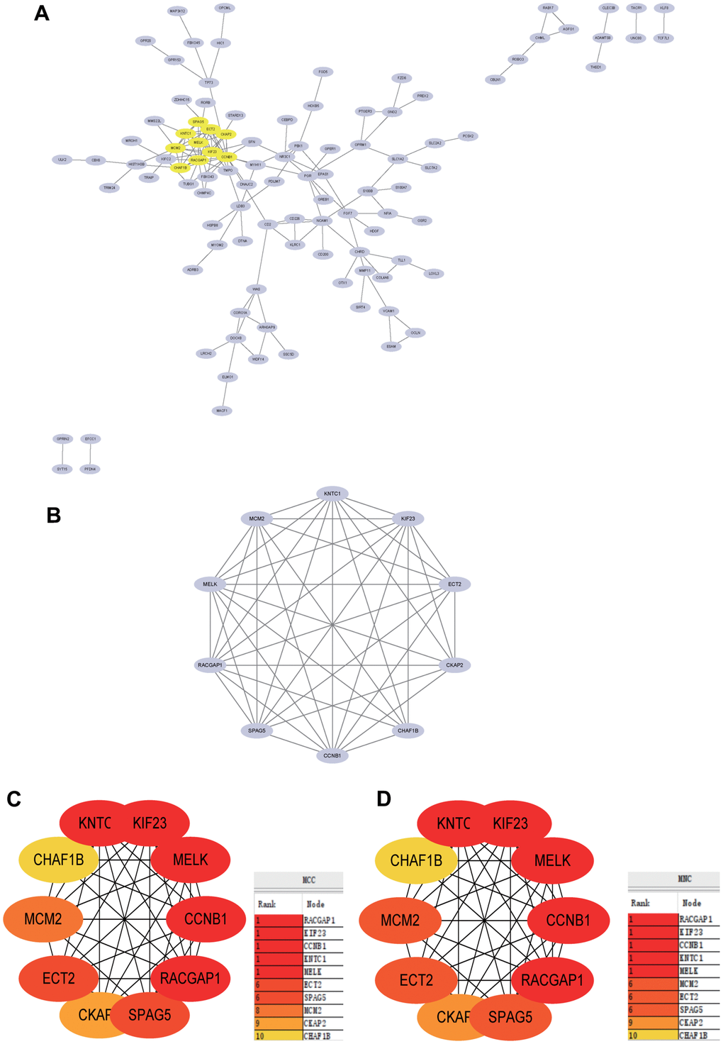 The PPI network was constructed by STRING and analyzed by Cytoscape (Figure 7A), the core gene cluster is obtained (Figure 7B). The hub genes were identified using two different algorithms (Figure 7C, 7D), Wayne diagram and intersection (Figure 8) are drawn, and 10 core genes (ECT2L, MELK, SPAG5, KIF23, CHAF1B, KNTC1, MCM2, CKAP2, RACGAP1, CCNB1) are obtained.