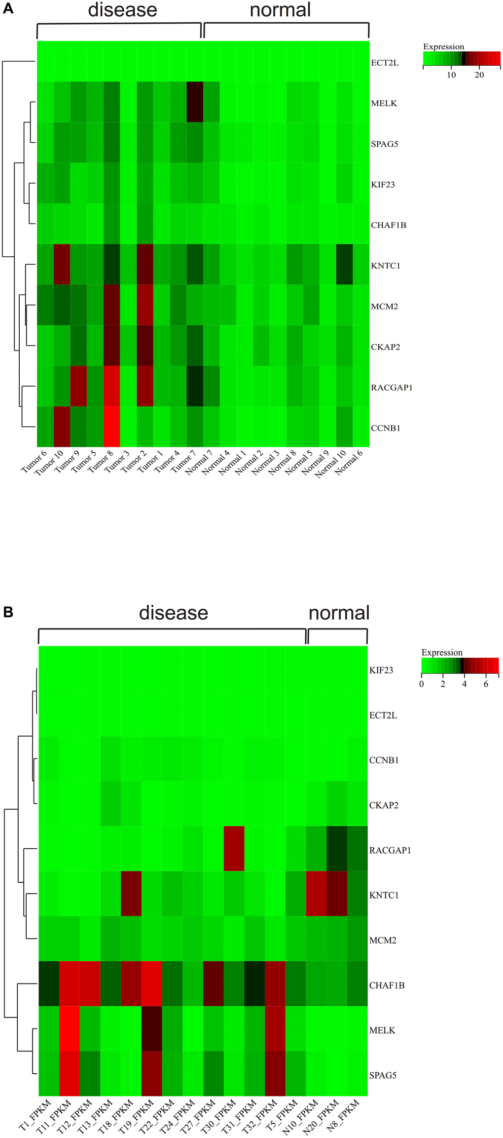 We obtained a visual differential heat map of core genes between gallbladder carcinoma and normal samples. We found that five core genes (KNTC1, MCM2, CKAP2, RACGAP1, CCNB1) were highly expressed in gallbladder carcinoma samples and low in normal samples. ECT2L, MELK, SPAG5, KIF23 and CHAF1B genes may play a regulatory role in gallbladder carcinoma (Figure 9A is the result of GSE139682, Figure 9B is the result of GSE202479).