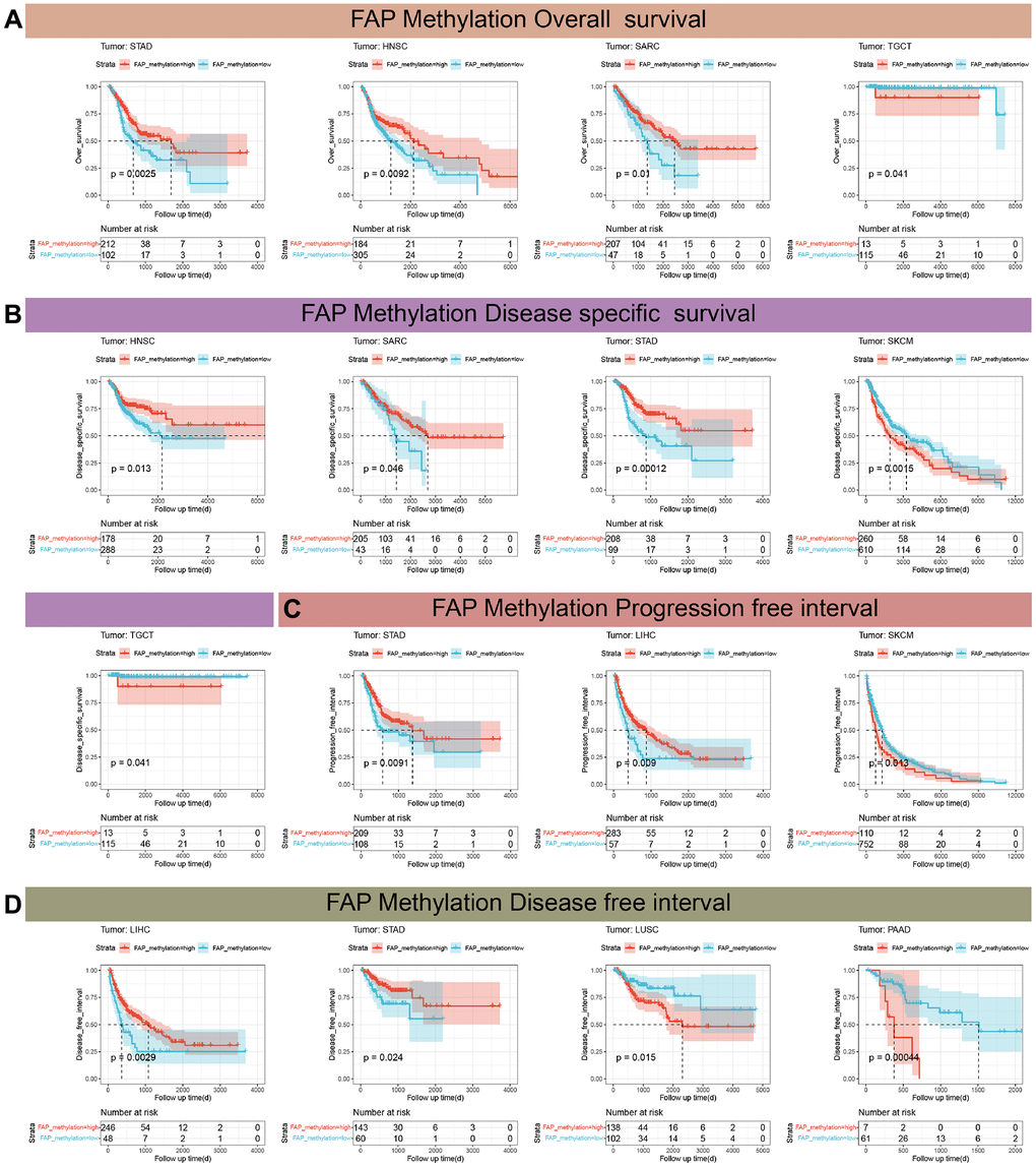 Supplementary Figure 6 illustrates a significant association between FAP expression and DNA methylation in ten different tumors. Furthermore, we conducted additional analysis to investigate the impact of DNA methylation levels on the prognosis of patients with tumors. Figure 10A, 10B indicates that elevated FAP methylation levels were associated with longer OS and DSS in STAD, HNSC, and SARC. In TCGT, high FAP methylation levels were linked to shorter OS and DSS. Moreover, high FAP methylation levels were correlated with a shorter DSS and PFI in SKCM (Figure 10C). In STAD and LIHC, increased FAP methylation levels were associated with a longer PFI and DFI, while in LUSC and PAAD, high FAP methylation levels were related to a shorter DFI (Figure 10D).