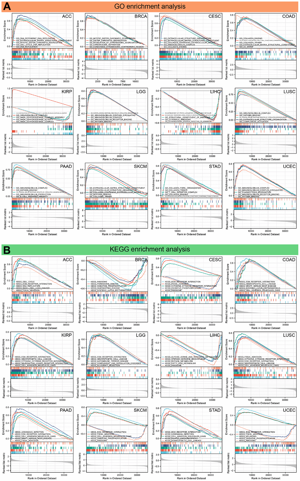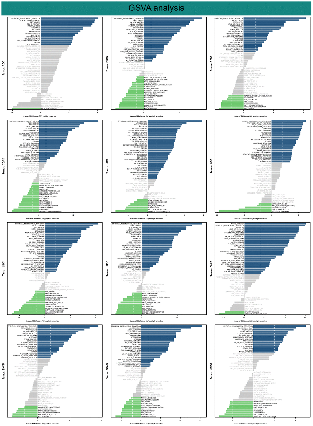 To investigate the biological significance of FAP expression, GSEA and GSVA analyses were conducted to explore the biological processes involved in FAP expression. Figure 11A illustrates that FAP positively regulates cell proliferation, migration, immune, and energy metabolism-related functions in eleven tumors, except for LIHC.