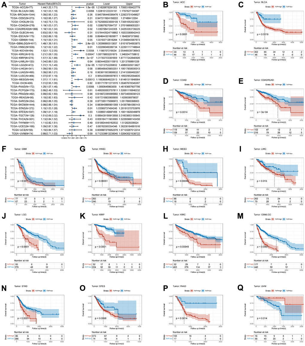 To investigate the correlation between the expression of FAP and prognostic indicators in tumor patients, namely OS, DFI, PFI, and DSS, we employed a Cox regression model and conducted KM survival analysis for each type of cancer. Statistical analysis was performed using the log-rank test. The results of the Cox regression model revealed a significant association between the level of FAP expression and OS in fourteen types of cancer, namely glioblastoma multiforme and lower-grade glioma (GBMLGG, HR = 1.48, p-value = 2.80E-20), kidney renal papillary cell carcinoma (KIRP, HR = 1.57, p-value = 3.00E-07), adrenocortical carcinoma (ACC, HR = 1.44, p-value = 1.50E-05), lower-grade glioma (LGG, HR = 1.31, p-value = 3.50E-05), mesothelioma (MESO, HR = 1.37, p-value = 1.30E-04), kidney renal clear cell carcinoma (KIRC, HR = 1.21, p-value = 4.70E-04), bladder urothelial carcinoma (BLCA, HR = 1.10, p-value = 5.80E-03), kidney chromophobe (KICH, HR = 1.52, p-value = 5.80E-03), pancreatic adenocarcinoma (PAAD, HR = 1.25, p-value = 5.80E-03), head and neck squamous cell carcinoma (HNSC, HR = 1.12, p-value = 0.01), stomach adenocarcinoma (STAD, HR = 1.15, p-value = 0.01), colon adenocarcinoma and rectum adenocarcinoma (COADREAD, HR = 1.18, p-value = 0.02), COAD (HR = 1.19, p-value = 0.02) and stomach and esophageal carcinoma (STES, HR = 1.09, p-value = 0.03) (Figure 2A). Therefore, FAP can be considered an independent risk factor for multiple types of cancer. The KM survival analysis further confirms that patients with high FAP expression have shorter OS in fifteen tumors (Figure 2B–2P). Conversely, UVM patients with high FAP expression exhibit longer OS, requiring further investigation (Figure 2Q).