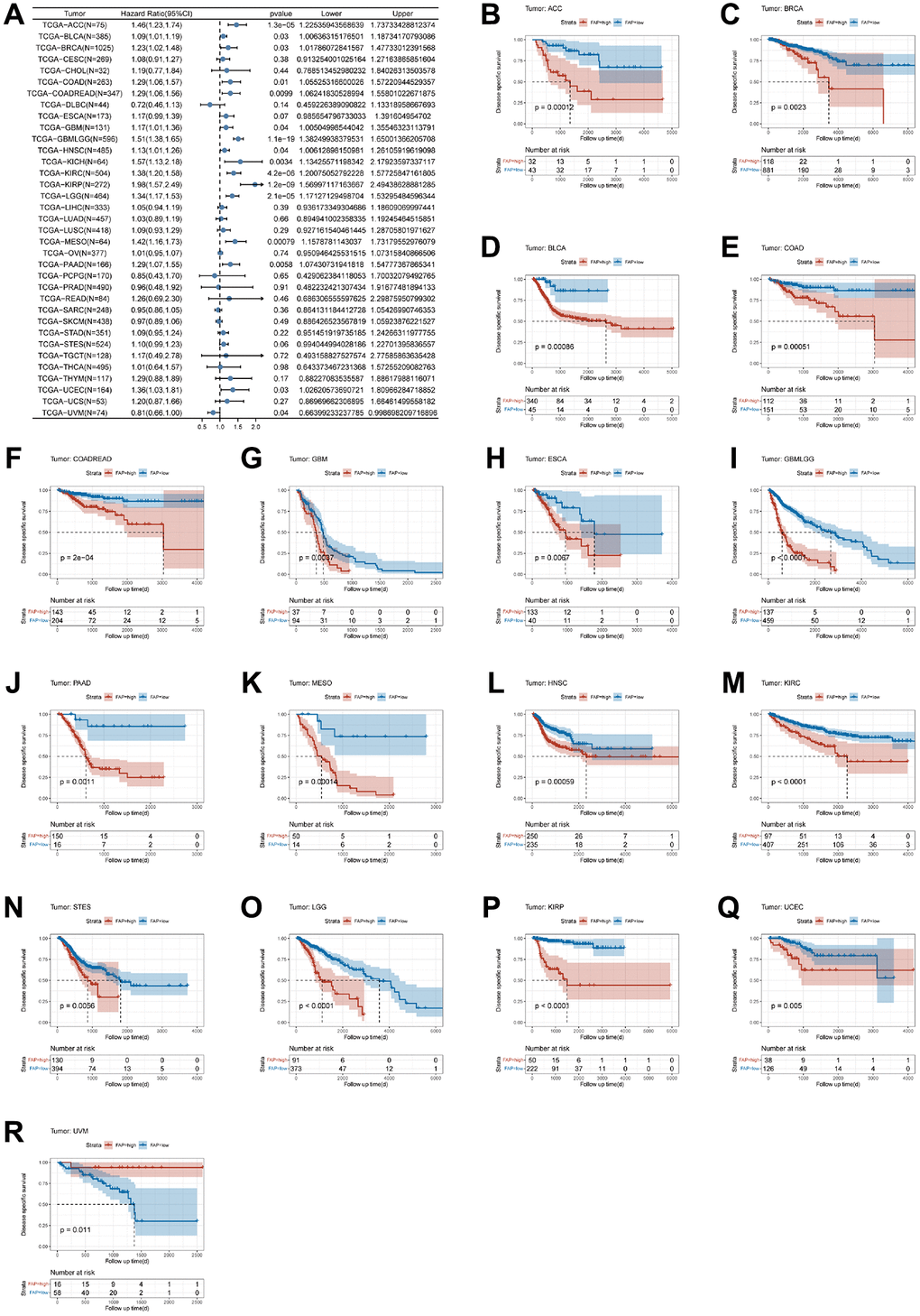 Similarly, FAP expression in seventeen cancers was strongly linked to DSS (Figure 3A). The KM survival analysis revealed that patients with FAP overexpression have shorter DSS in sixteen tumors, including ACC (p-value = 0.00012), BRCA (p-value = 0.0023), BLCA (p-value = 0.00086), COAD (p-value = 0.00051), COADREAD (p-value = 2e-04), GBM (p-value = 0.0037), ESCA (p-value = 0.0067), GBMLGG (p-value < 0.0001), PAAD (p-value = 0.0011), MESO (p-value = 0.00014), HNSC (p-value = 0.00059), KIRC (p-value < 0.0001), STES (p-value = 0.0056), LGG (p-value < 0.0001), KIRP (p-value < 0.0001), and UCEC (p-value = 0.005), while UVM patients with high FAP expression have longer DSS times (p-value = 0.011) (Figure 3B–3R).