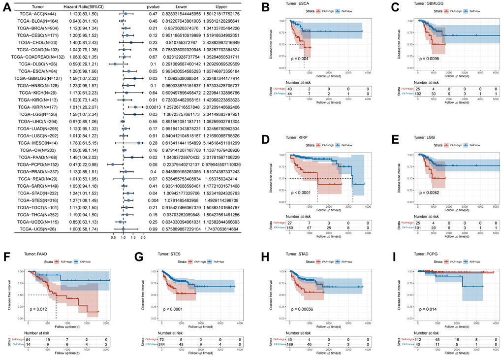 Figure 4A showed that FAP expression was significantly related to DFI in six tumors, including KIRP (HR = 1.61, p-value = 0.00013), STES (HR = 1.27, p-value = 0.004), PAAD (HR = 1.45, p-value = 0.02), GBMLGG (HR = 1.58, p-value = 0.03), LGG (HR = 1.58, p-value = 0.03), and STAD (HR = 1.24, p-value = 0.04). Figure 4B–4H further demonstrated that individuals with high FAP expression have shorter DFI times, including ESCA (p-value = 0.004), GBMLGG (p-value = 0.0095), KIRP (p-value < 0.0001), LGG (p-value = 0.0082), PAAD (p-value = 0.012), STES (p-value < 0.0001), and STAD (p-value = 0.00056). In contrast, pheochromocytoma and paraganglioma (PCPG) patients with high FAP expression had longer DFI times (p-value = 0.014) (Figure 4I).