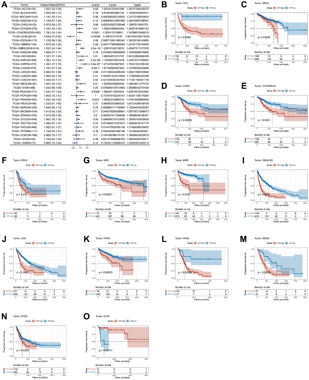Furthermore, we conducted a comprehensive analysis of the correlation between FAP expression and PFI in various tumors. The forest plot revealed a positive association between FAP expression and poor prognosis in eleven tumors, such as GBMLGG, KIRP, KIRC, LGG, PRAD, PAAD, COADREAD, COAD, KICH, MESO, and ACC (Figure 5A). Additionally, the KM curve analysis further confirmed that high FAP expression was associated with poor PFI in thirteen tumors (Figure 5B–5N). However, FAP expression was found to be positively associated with improved prognosis in lymphoid neoplasm diffuse large B-cell lymphoma (DLBC, HR = 0.63, p-value = 0.00092) (Figure 5O).