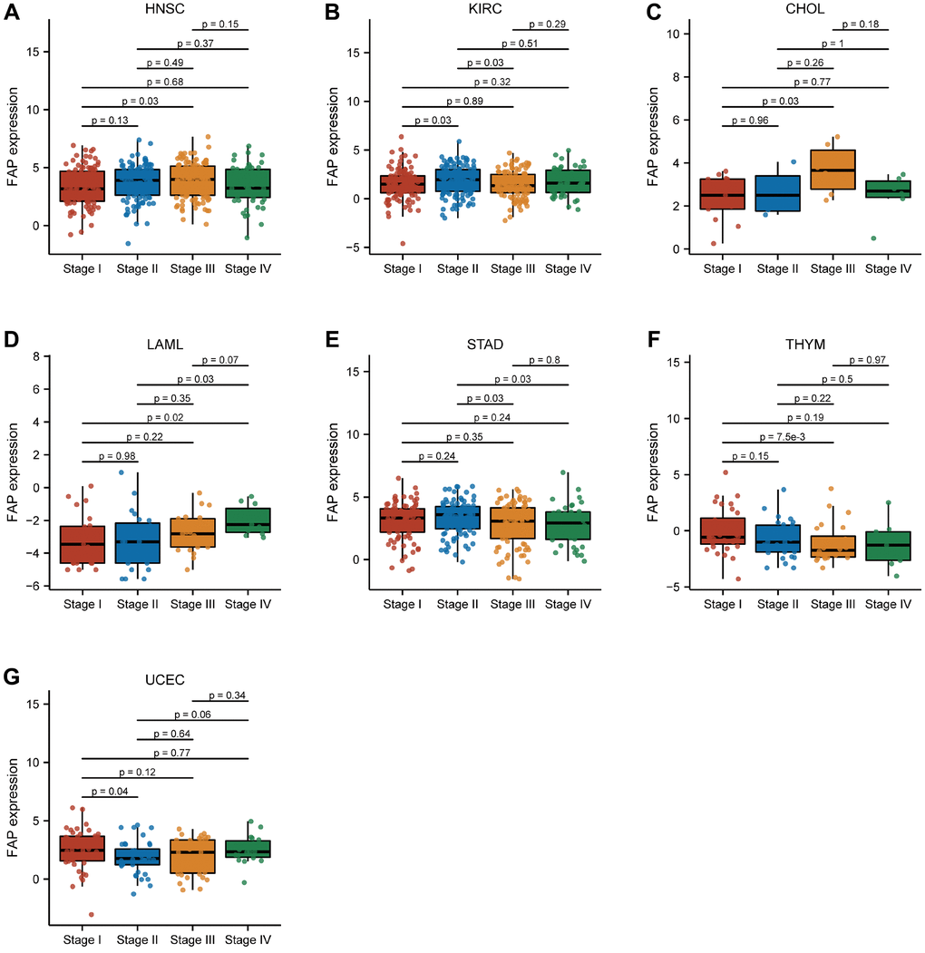 Furthermore, we also analyzed the association between FAP expression and pathological stage for each type of cancer. Our data reveals a significant correlation between FAP expression and pathological stage in seven tumors, including HNSC, KIRC, cholangiocarcinoma (CHOL), LAML, STAD, thymoma (THYM), and UCEC (Figure 7). In HNSC, CHOL, and LAML, FAP expression is significantly lower in stage I and II compared to stage III and IV. On the other hand, in STAD and THYM, FAP expression is significantly higher in stage I and II compared to stage III and IV. In KIRC, FAP expression in stage II is significantly higher than in stage I and III. In UCEC, FAP expression in stage I is substantially higher than in stage II.