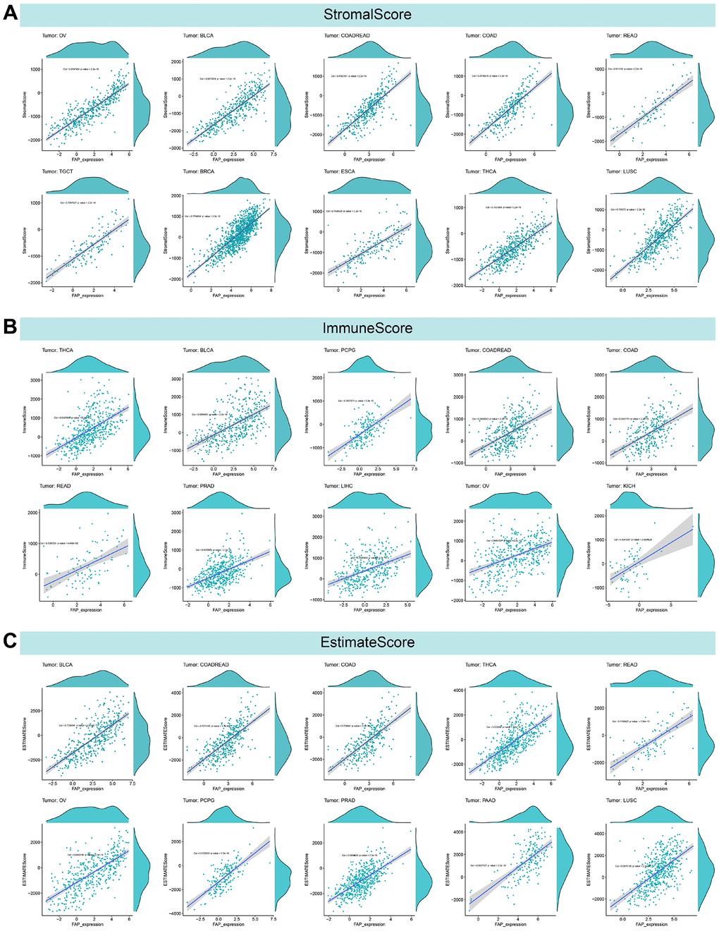 Based on the transcriptional profiles of tumor samples, the abundance of tumor cells, stromal cells, and immune cells was assessed using the R package “ESTIMATE”. The association between FAP expression and stromal, immune, and ESTIMATE scores was evaluated using the Spearman method. The results were visualized utilizing the R package “ggpubr”.