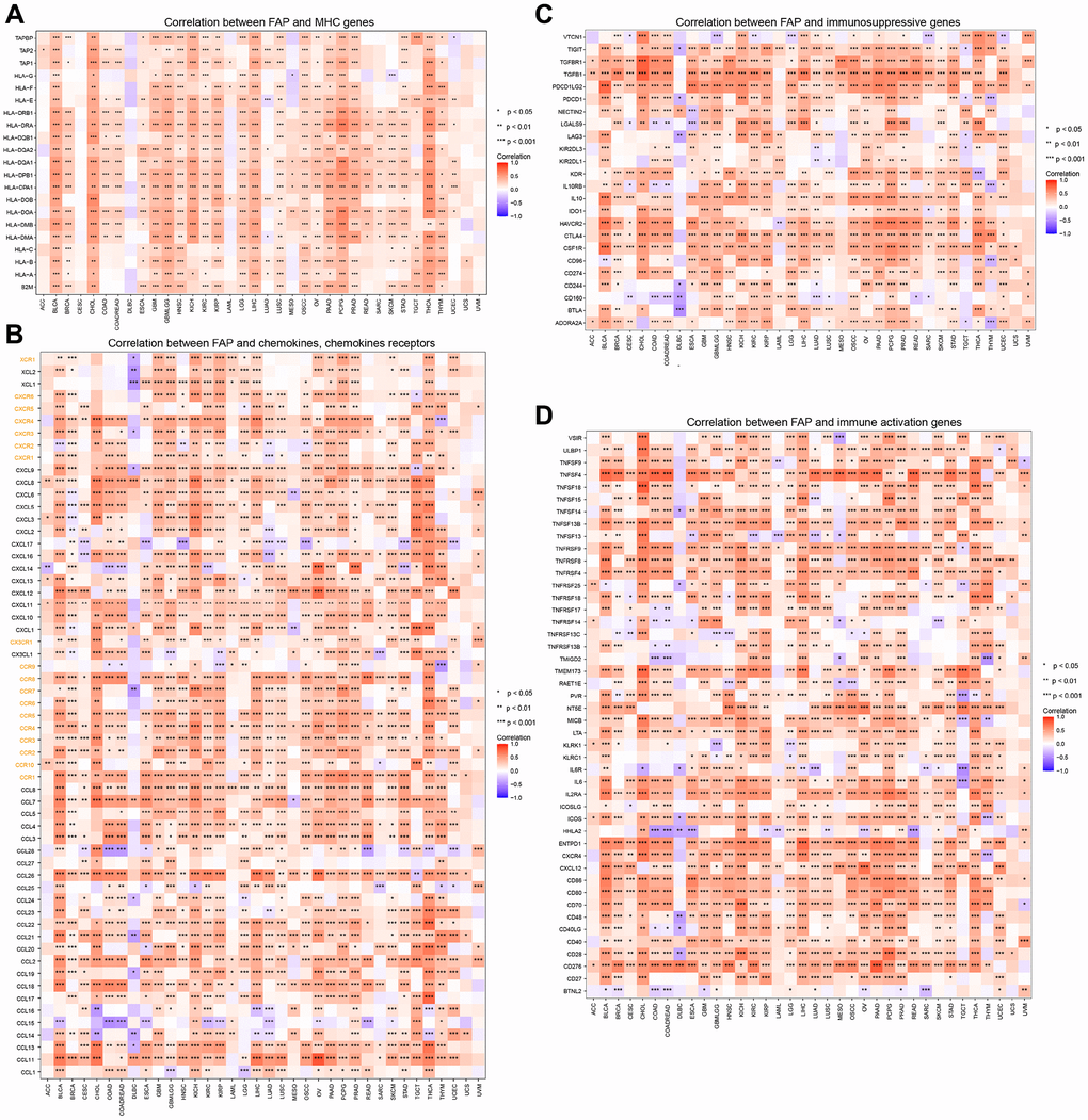 To further study the role of FAP expression in tumor immunity, an analysis of the connection between FAP expression and MHC genes, immune activators, immune suppressors, chemokines, and chemokine receptors was conducted in 36 tumors. The heatmap illustrates that most immune-related genes have a significant positive correlation with FAP expression across cancer types, except for DLBC (Figure 9A–9D). Supplementary Figure 5 depicts cancers with the strongest connection between FAP expression and infiltration levels of 22 immune cells; data for other malignancies can be found in Supplementary Table 2.