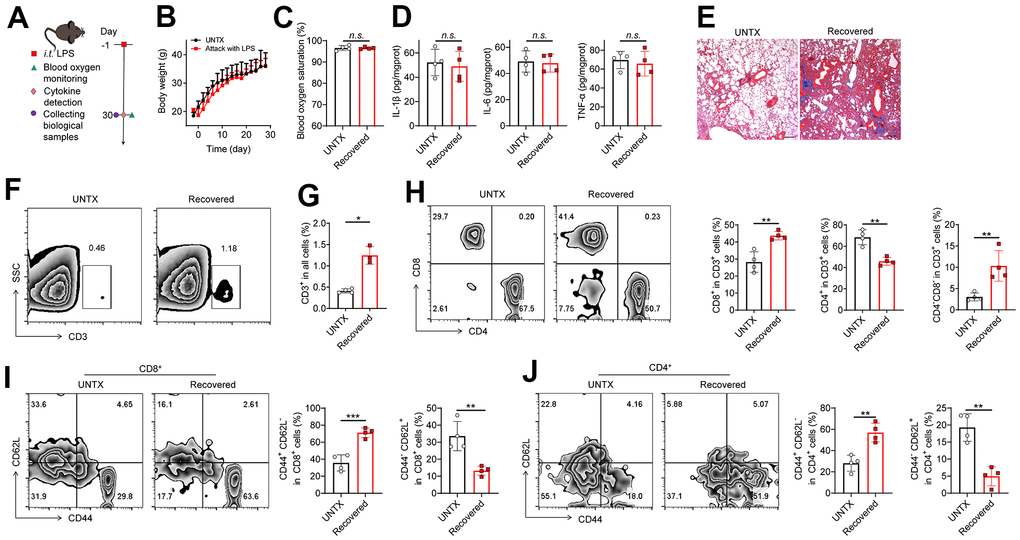 We established LPS-induced pneumonia (in tracheal injection) to study the changes in the immune context of mice after the pneumonia subsided (Figure 1A). The result showed that the mice experienced temporary weight loss after LPS attack but returned to normal at day 30 (Figure 1B). The levels of blood oxygen saturation and lung cytokines such as IL-1β, IL-6, and TNF-α were at normal range to those of untreated mice at 30 days (Figure 1C, 1D), indicating the respiratory function was recovered and inflammatory condition of the lung was regressed after 30 days. However, in line with previous study [15], pulmonary fibrosis progression was observed in lung tissues after the pneumonia subsided, as shown by Masson staining (Figure 1E), indicating the lungs undergo a healing process in which scar tissue forms.